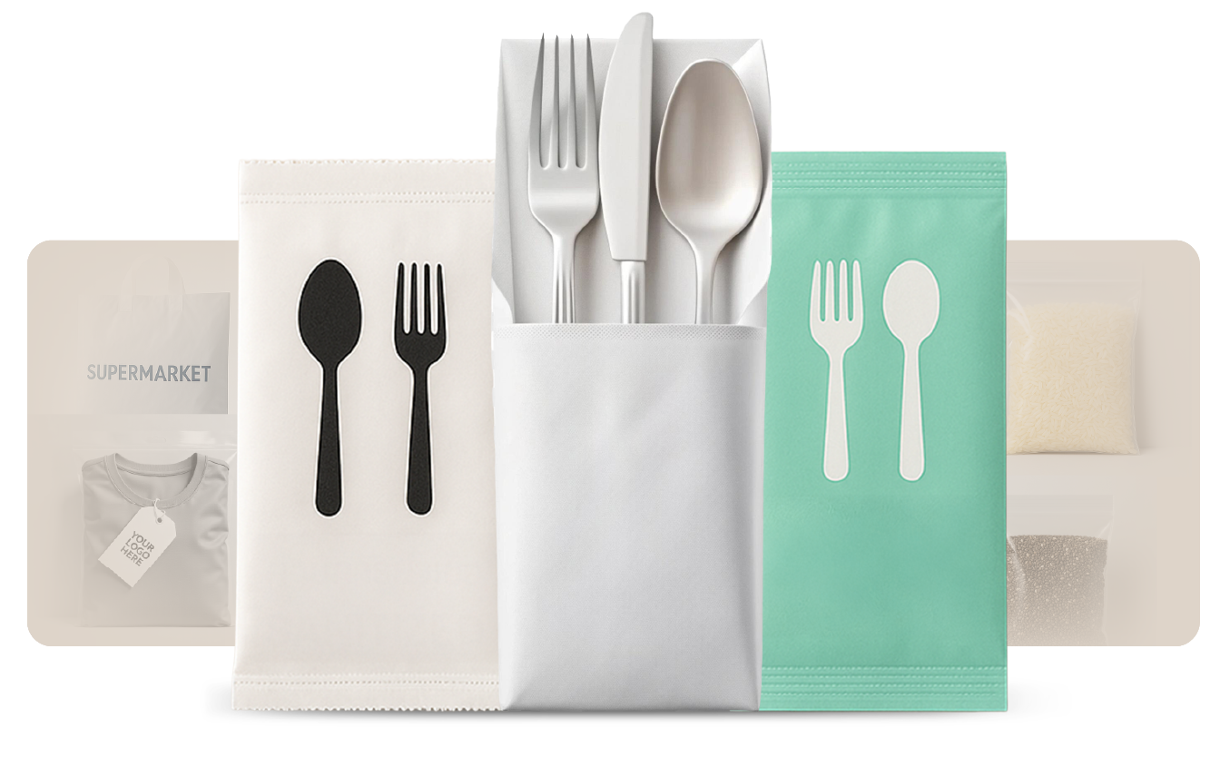 เรารับผลิต ถุงใส่ช้อนส้อม ทุกขนาด ทั้งสำหรับชุดช้อน-ส้อมเดี่ยว หรือชุดพร้อมทิชชู่ พร้อมเลือกความหนาและรูปแบบปิดผนึกได้ตามต้องการ ไม่ว่าจะเป็นปิดด้วยความร้อน, ซีลด้านบน หรือแบบกาวลอกปิด เพื่อให้ใช้งานสะดวกและเหมาะกับลักษณะการเสิร์ฟของธุรกิจคุณ